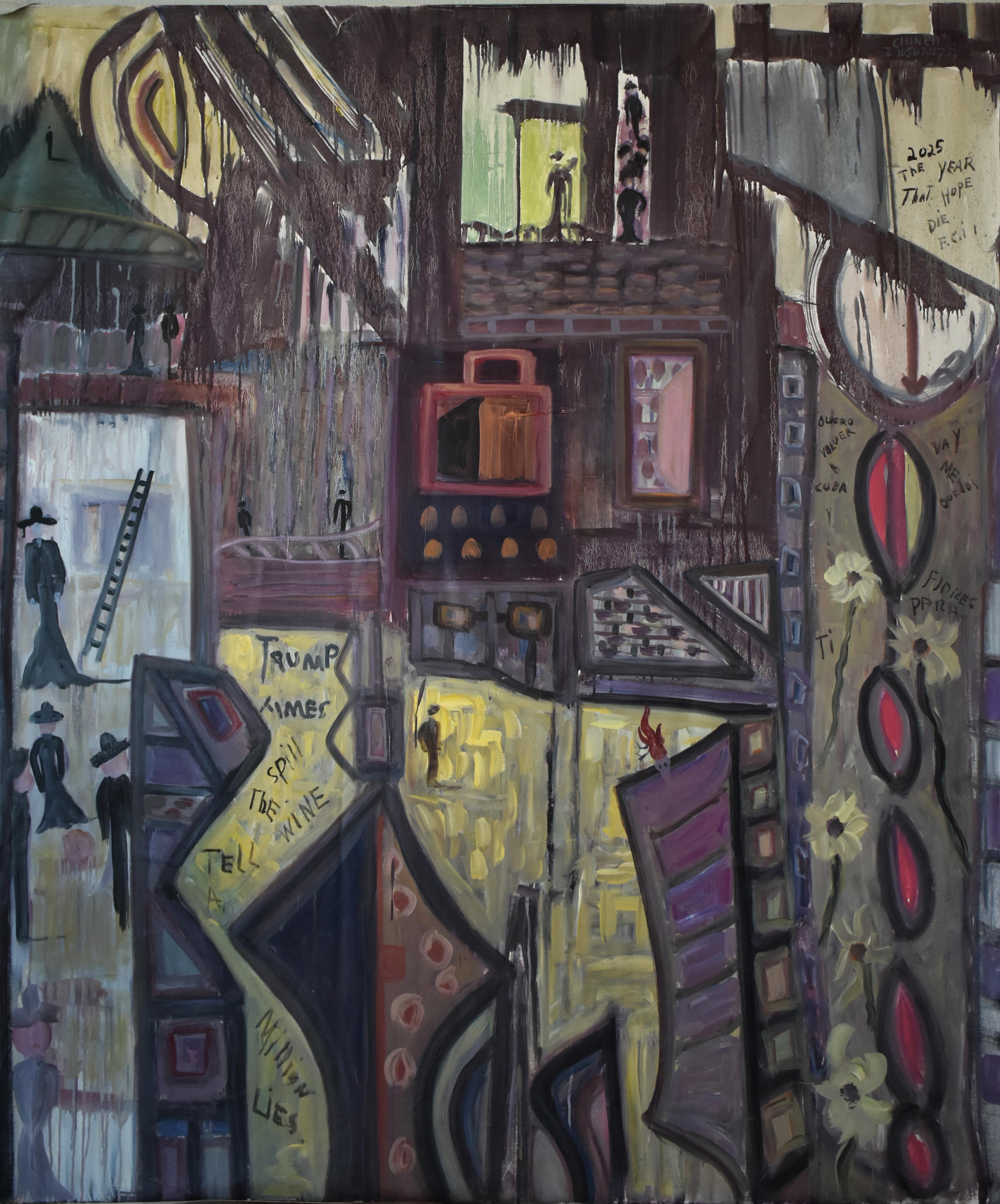 Through shadowy silhouettes, intense color fields, and emotionally charged tones, Frank transforms the canvas into a living surface, one that confronts struggle while preserving fragments of hope. His process is spontaneous and intuitive, often unfolding through “accidents” that allow the material itself to speak.